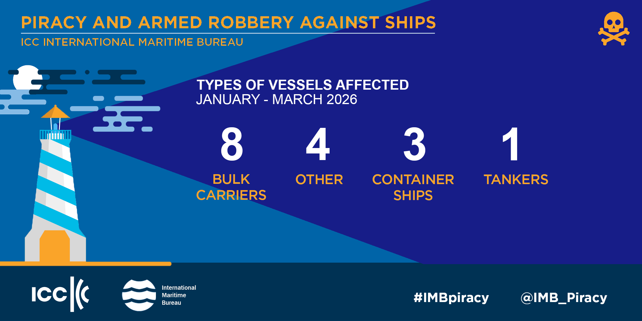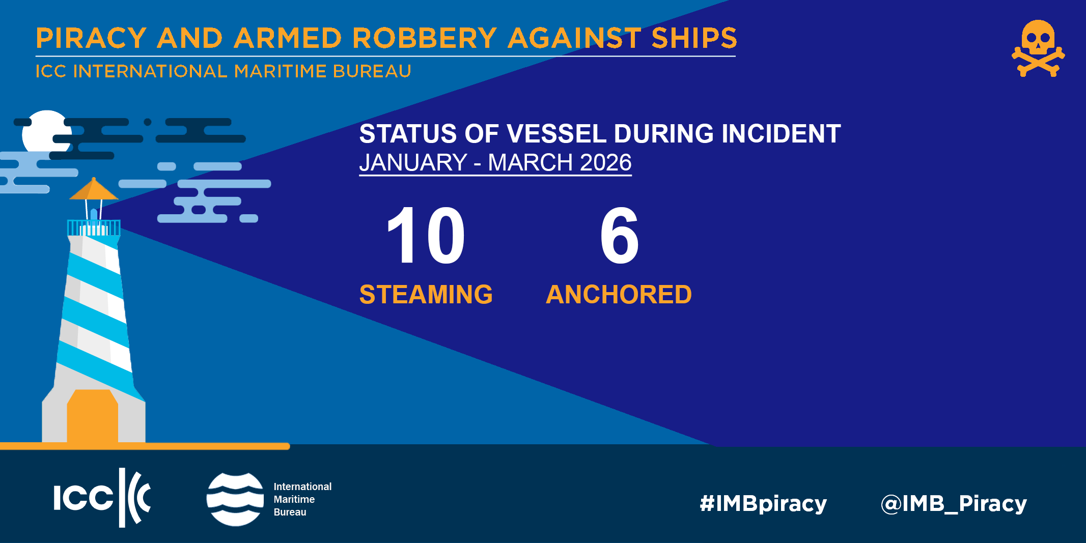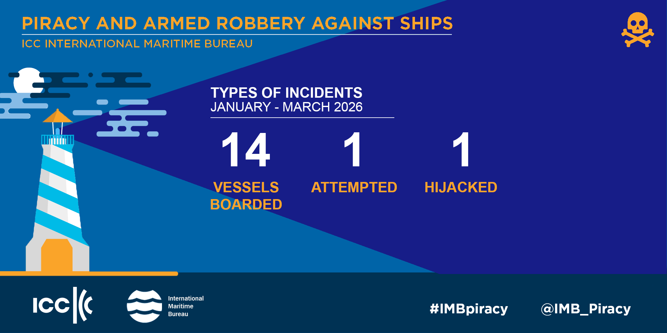 London, 8 April 2026 – The ICC International Maritime Bureau (IMB) reported a sharp fall in global maritime piracy and armed robbery incidents in the first quarter of 2026, with just 16 incidents recorded worldwide – the lowest first quarter figure since 1991. While the decline highlights the positive impact of sustained cooperation and enforcement efforts, risks to seafarers remain. IMB continues to urge vigilance, timely reporting and strict adherence to best management practices to help safeguard crews and protect vital maritime trade routes.