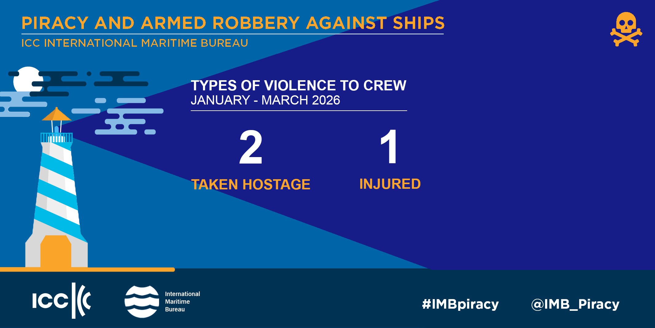 During the first three months of 2026, two crew members were taken hostage and one was injured. Weapons were reported in a number of incidents, with knives identified in seven cases and guns in two incidents during the reporting period.