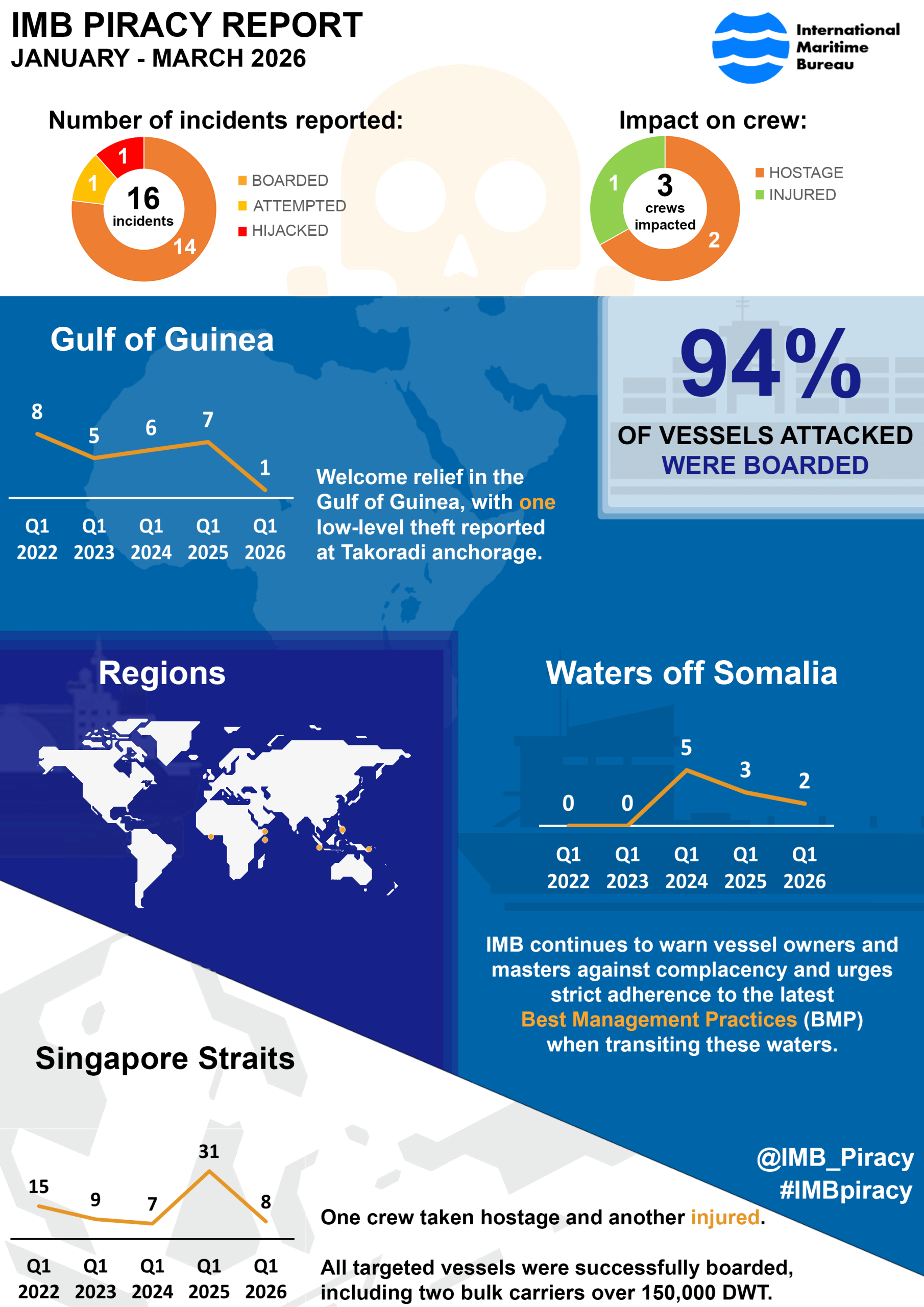 Between January and March 2026, 16 incidents were reported worldwide, down from 45 in Q1 2025 and 33 in Q1 2024. The incidents included 14 vessels boarded, one hijacking and one attempted attack.